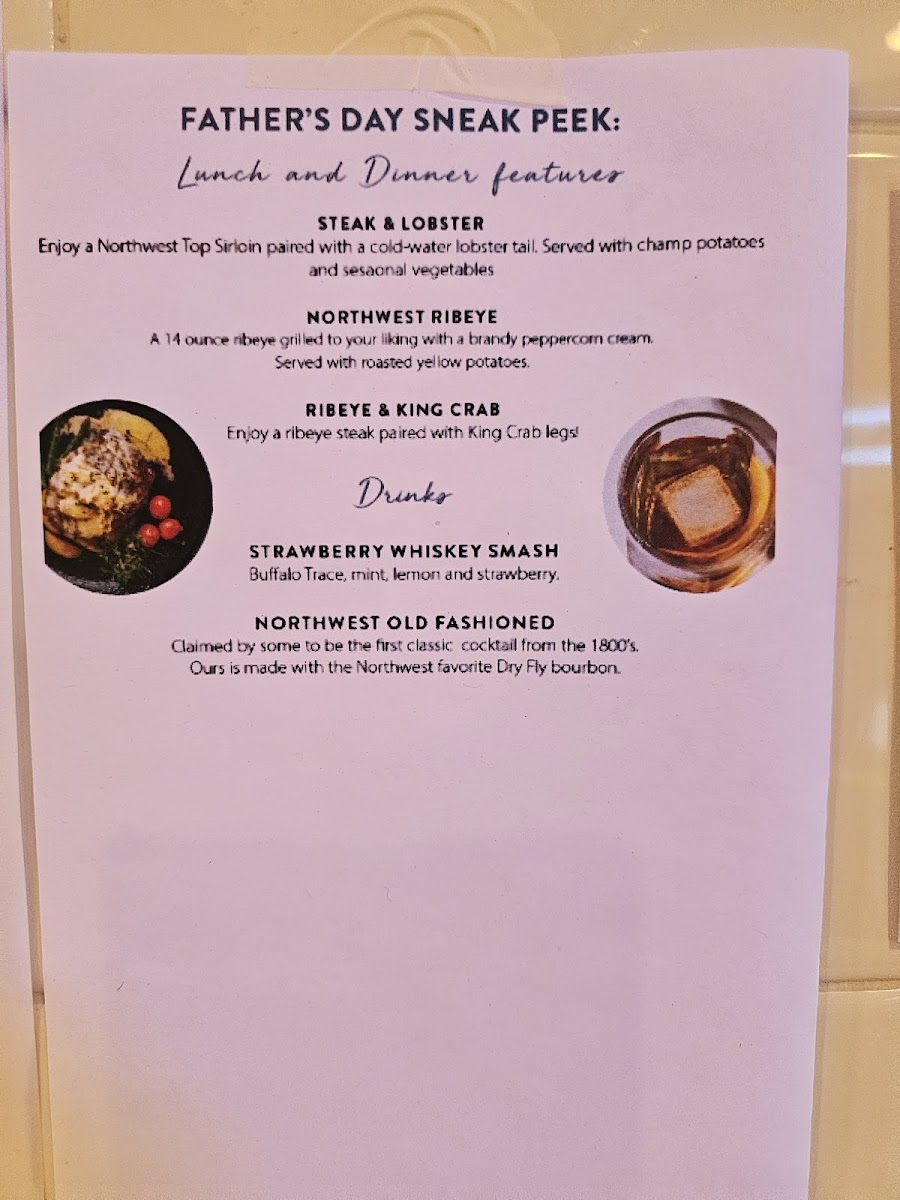 For something heartier, indulge in the N.W. steaks and burgers showcasing premium ingredients like the Bison Wagyu Burger and Certified Angus Beef Tenderloin, expertly grilled for a flavorful experience.
